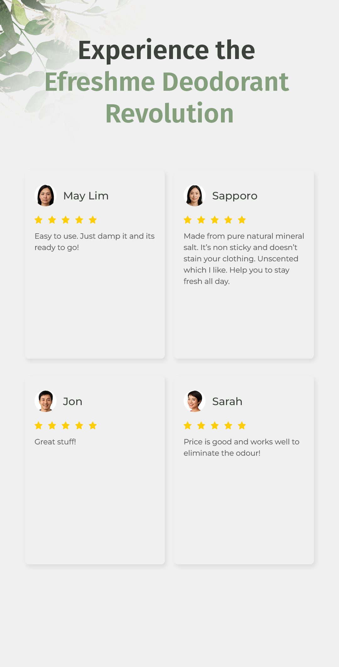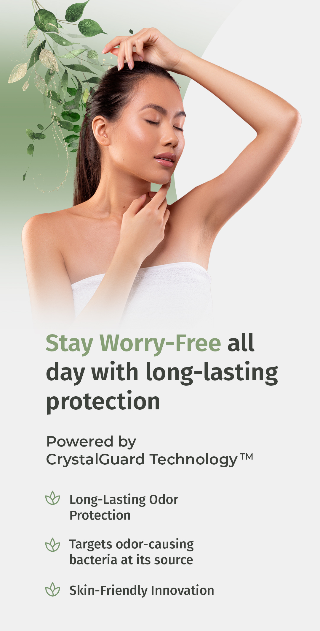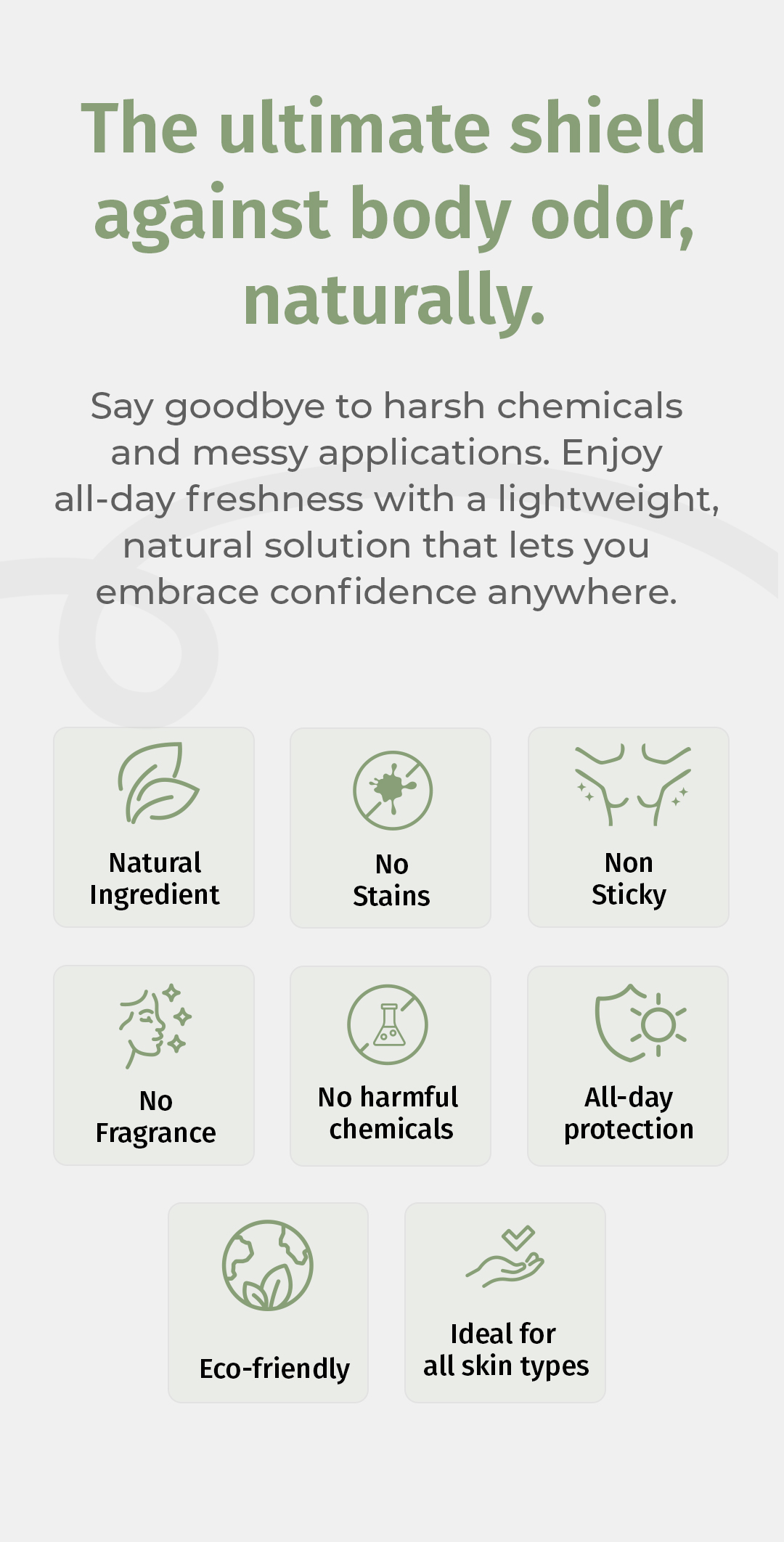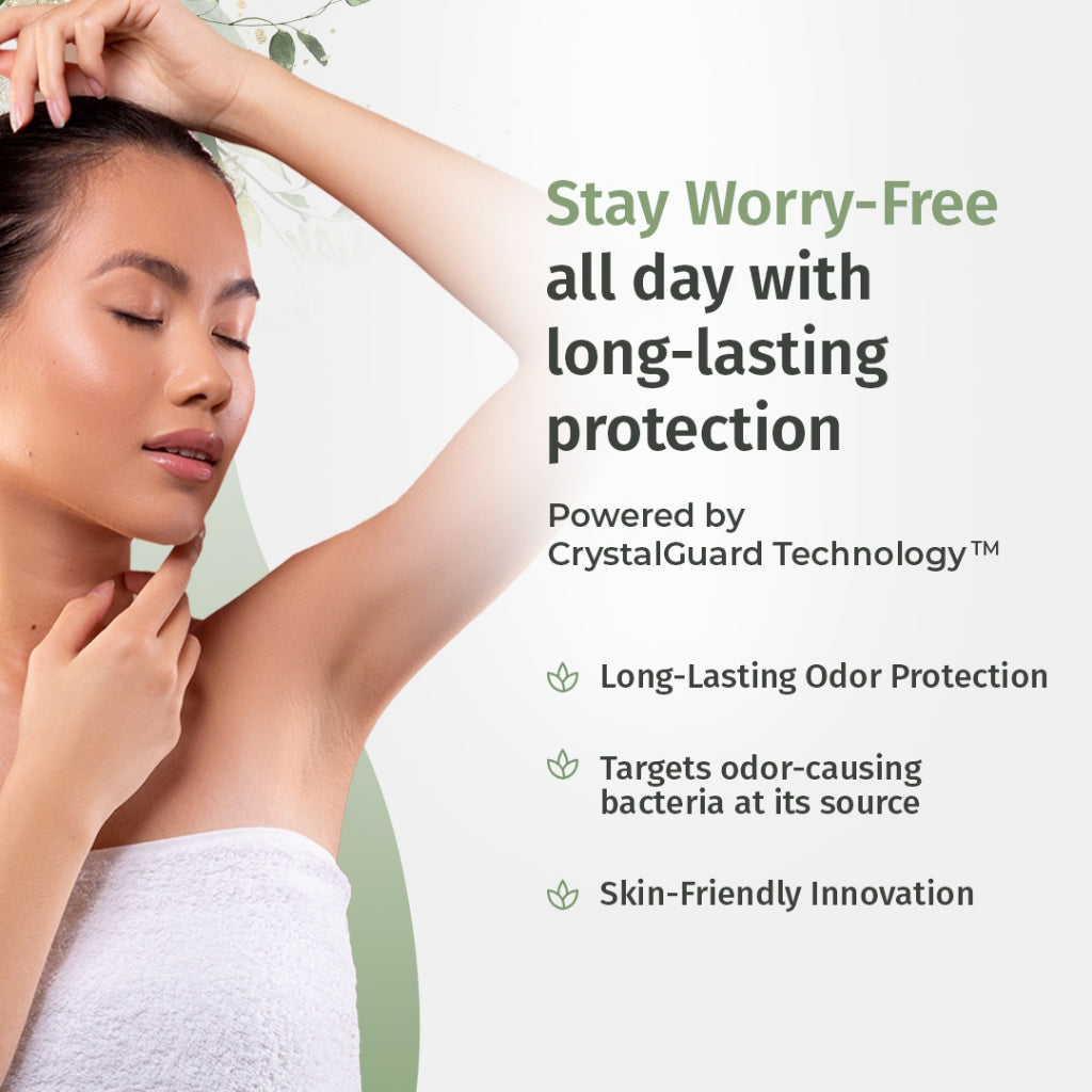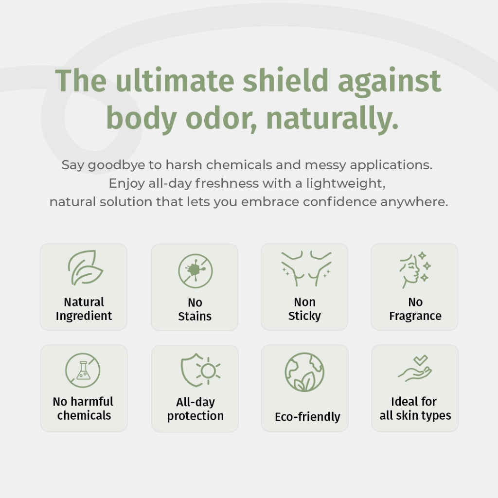 ● Stay Fresh All Day ● No sticky residue or white marks ● Anti bacterial & Anti odour ● Pure mineral salts