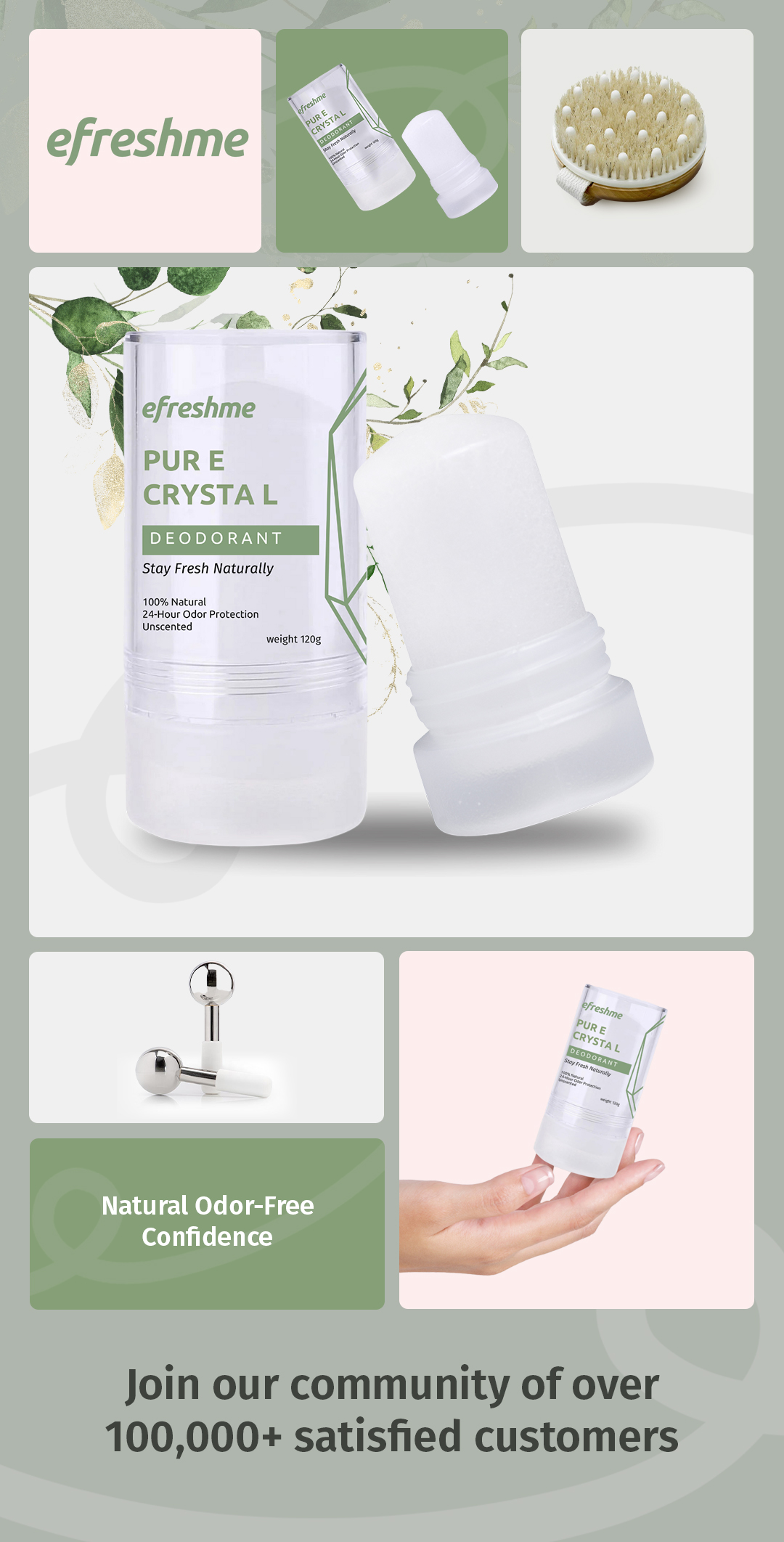 Efreshme Natural Crystal Mineral Deodorant Stone - Unscented Body 24 Hour Odor Protection 120g